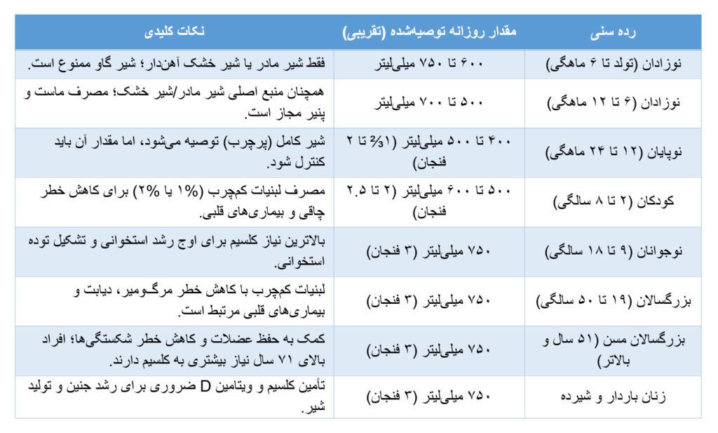 میزان توصیه شده مصرف شیر و لبنیات بر اساس سن (راهنمای جهانی):